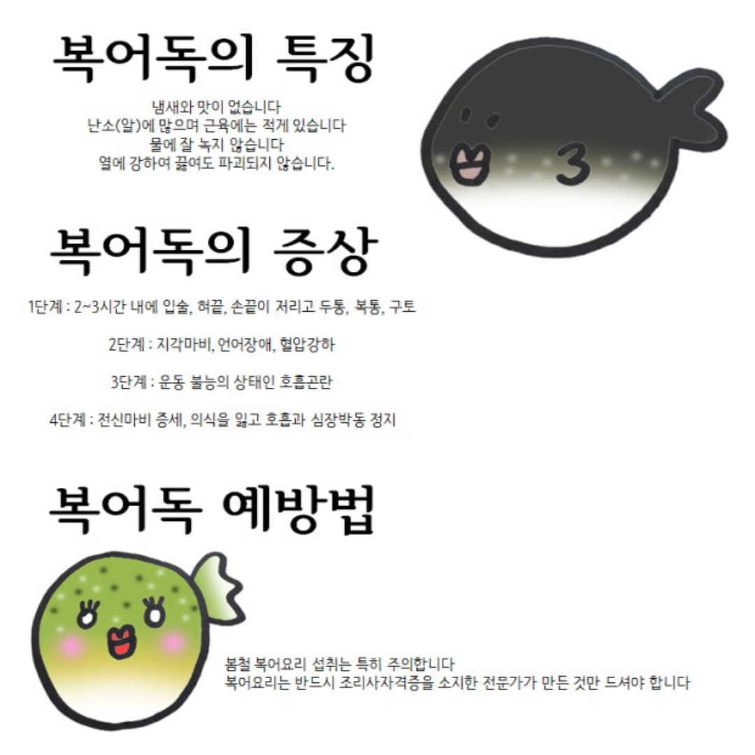 - 복어와 복어알은 맹독성으로 인해 생명까지 위협받을 수 있는 식품입니다.